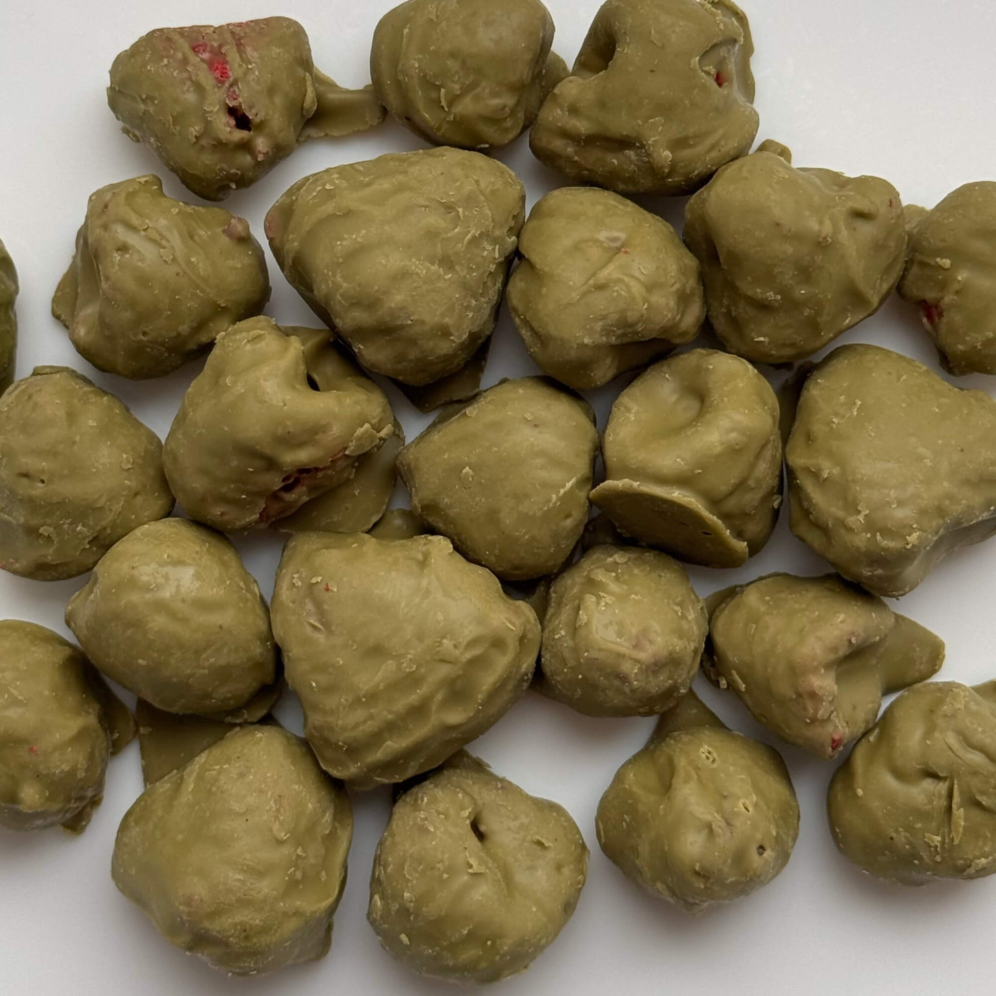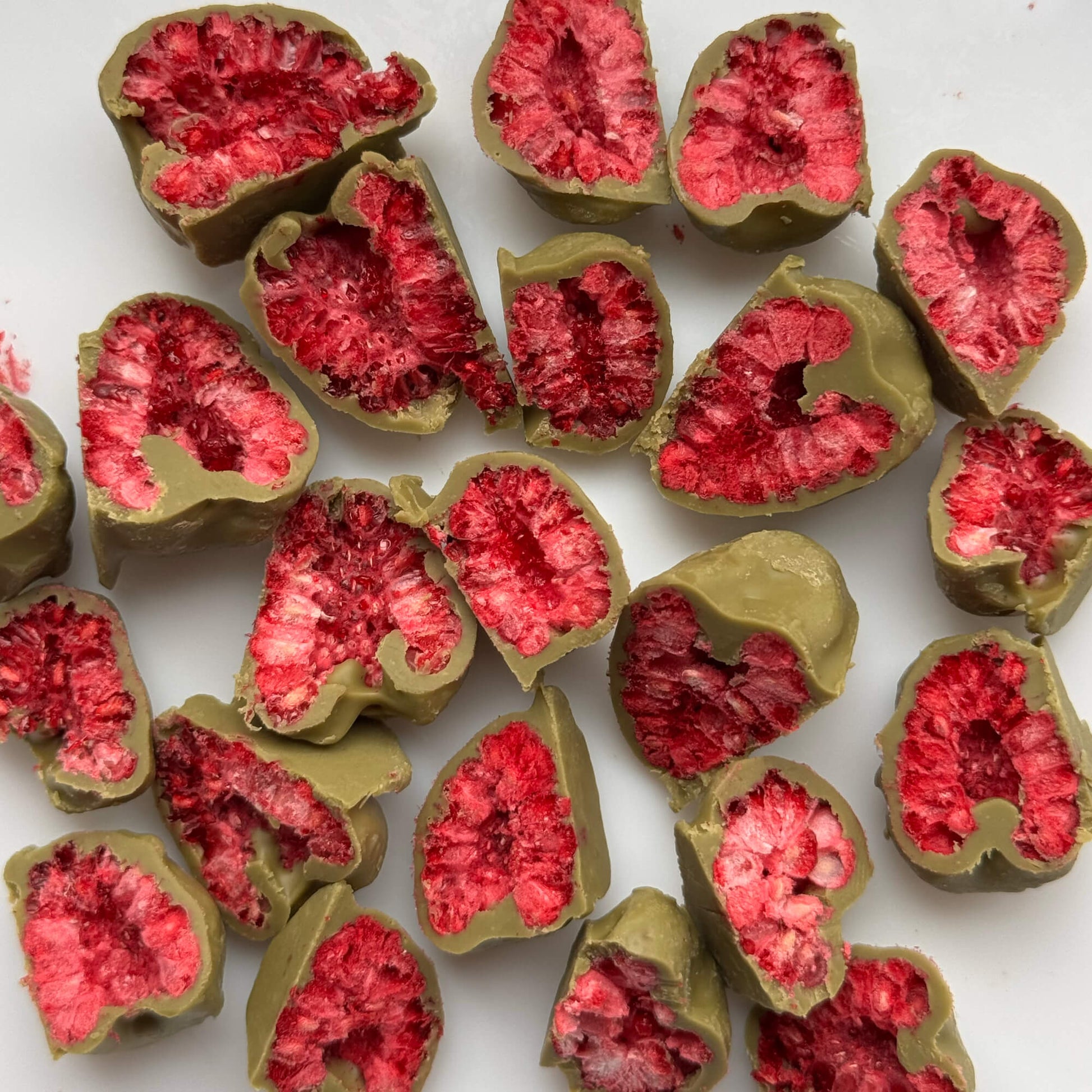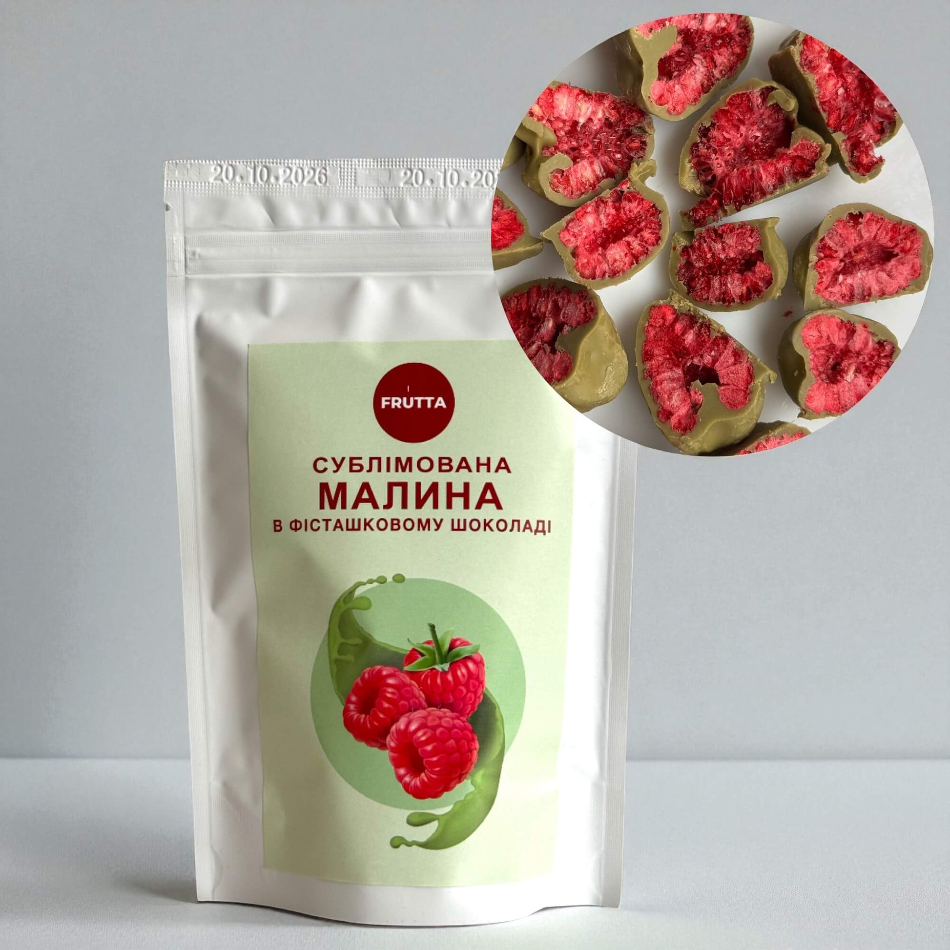 Сублімована малина, вкрита фісташковим шоколадом — це вишукане поєднання яскравої ягідної кислинки та делікатної горіхової солодкості.