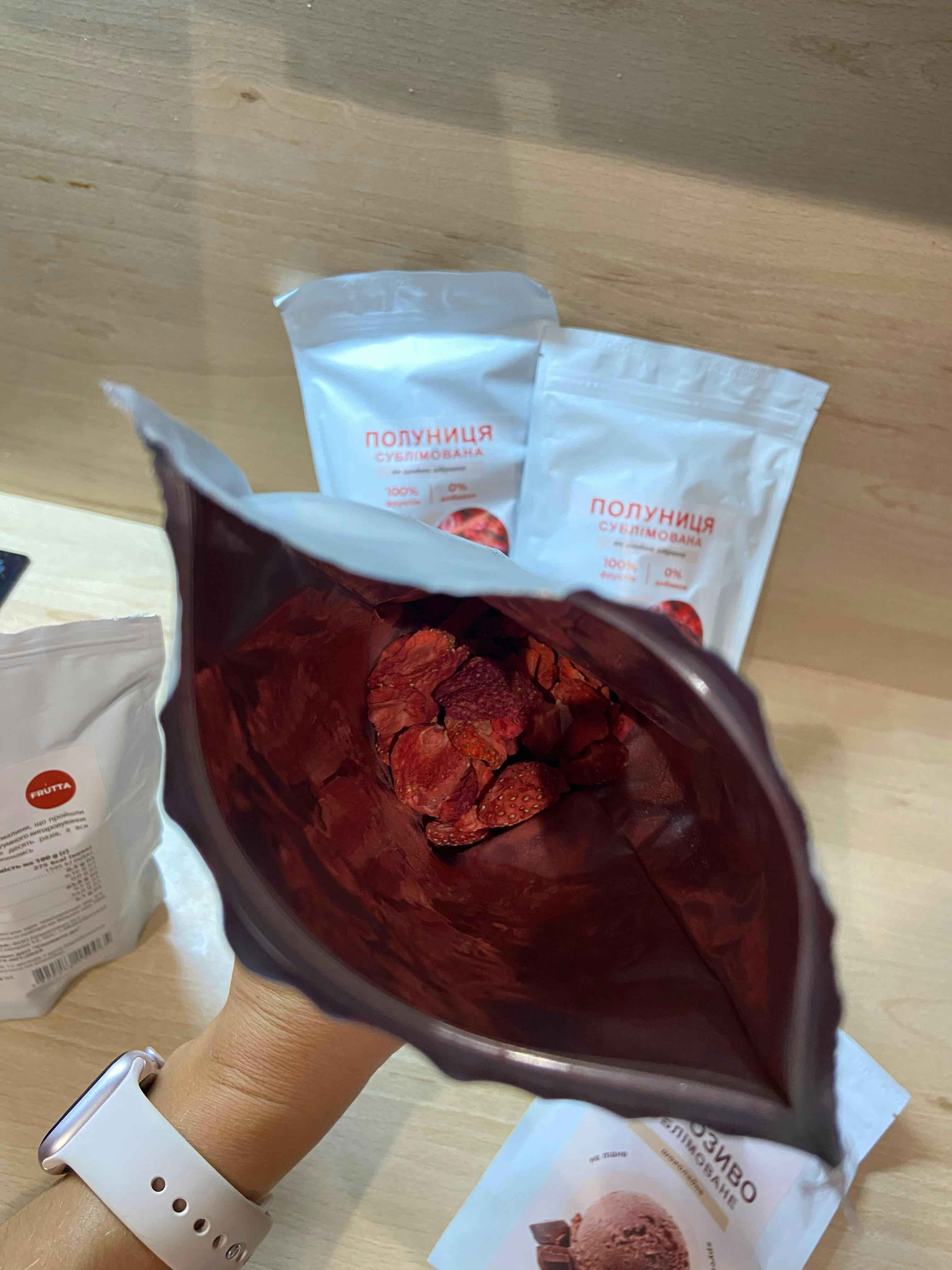 Ми беремо свіжу полуницю вищої якості та сублімуємо її (тобто випаровуємо вологу), але зберігаємо смак та поживні речовини, далі герметично упаковуємо її, щоб забезпечити вам здоровий смачний перекус. Сублімована полуниця стає світлою і з хрускотом. Смак інтенсивний. Красивий колір, запах та смак залишаються незмінними до 3-5 років (при правильному зберіганні). Виготовлену в Україні, ми пакуємо наш продукт одразу на виробництві. В результаті отримуємо пакет із завждисвіжою ароматною полуницею