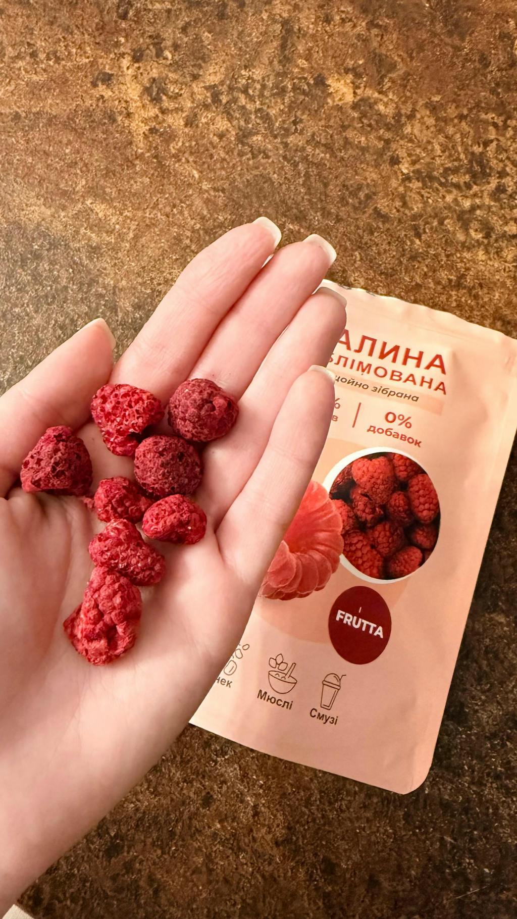 Малина трошки кисла, тому наступний раз краще візьму в шоколаді. Але текстура і розмір ягід чудові. Справді якісний та корисний снек