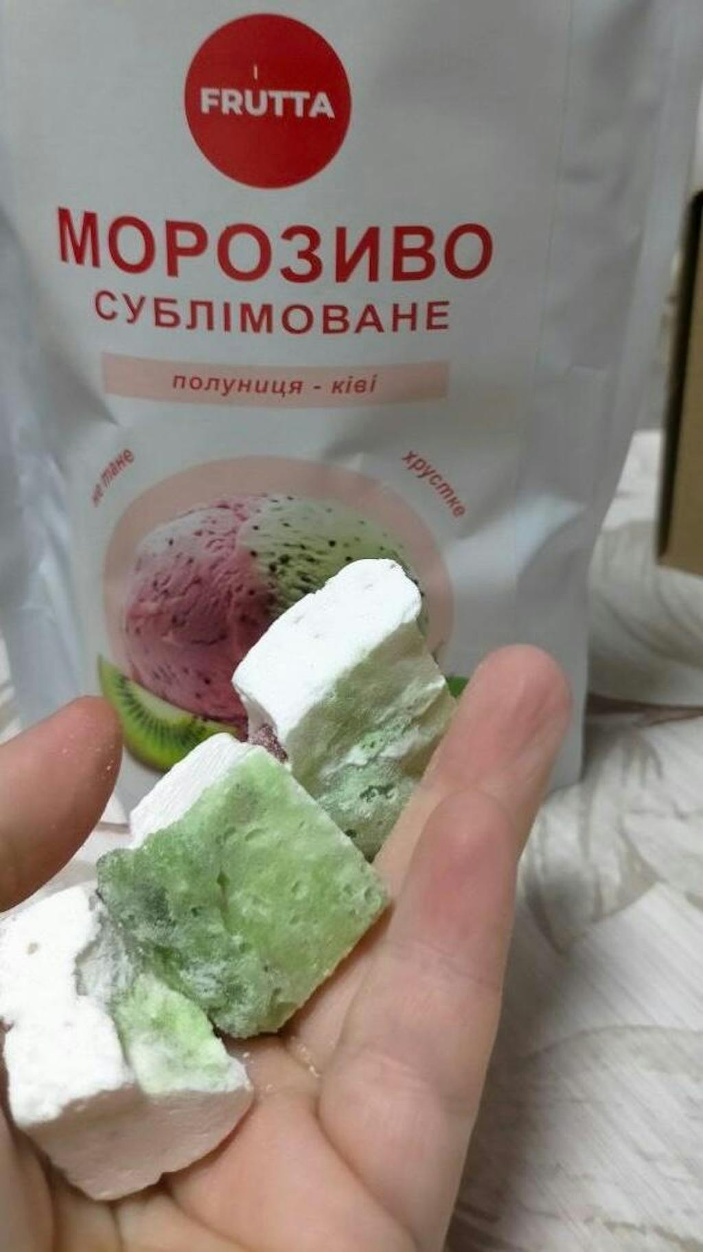 Состав: мороженое сублимированное 100% (молоко обезжиренное, наполнитель плодово-ягодный 20% (клубника 50%, концентрированный сок клубники 5%, вода питьевая, стабилизатор Е 440, кислота Е 330, ароматизатор, концентрированный сок черной моркови), масло кофе «Киви» 6% (сахар, пюре Киви 40%, глюкозо-фруктозный сироп, вода питьевая, стабилизатор (крахмал, модифицированный, стабилизатор Е 440), кислота Е 330, ароматизатор, краситель натуральный Е 100), молоко обезжиренное сухое, 7 Е7, 4 412, Е 410), кислота Е 330, ароматизатор).